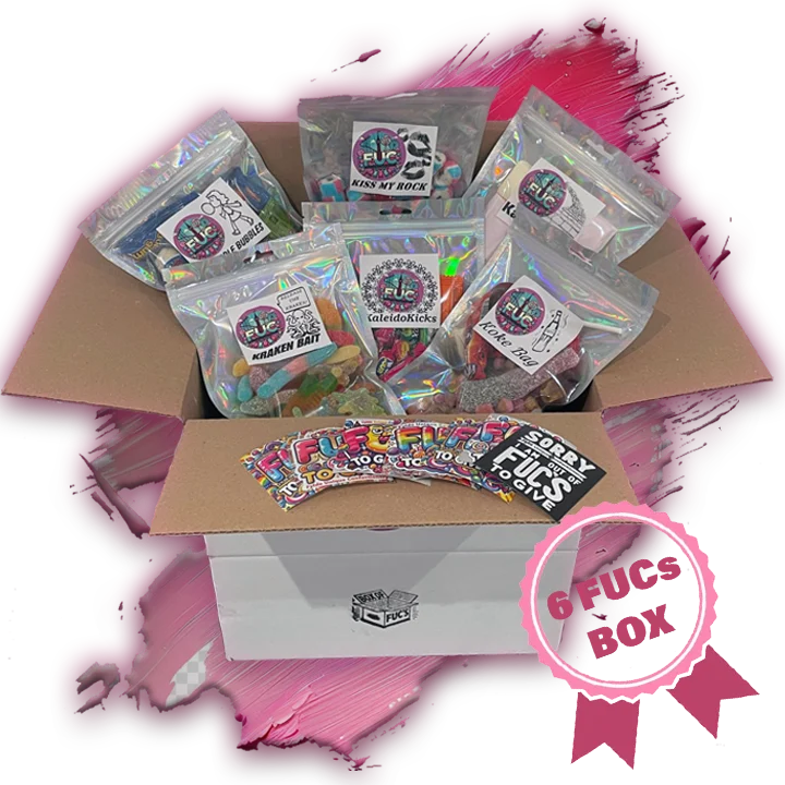6 bold, beautiful bags of bite-sized chaos with 6 "Fucs to give" and 1 "sorry I'm out of Fucs to give" stickers.