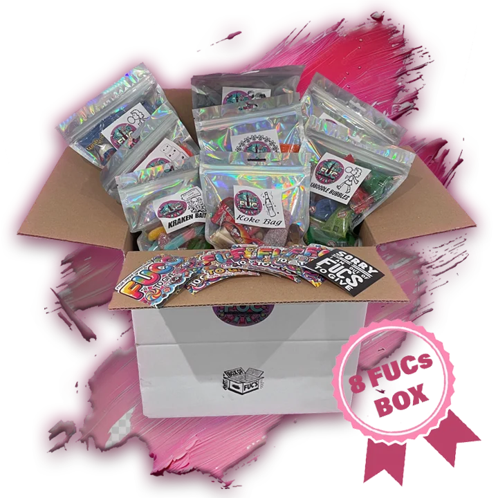8 bold, beautiful bags of bite-sized chaos with 8 "Fucs to give" and 1 "sorry I'm out of Fucs to give" stickers.