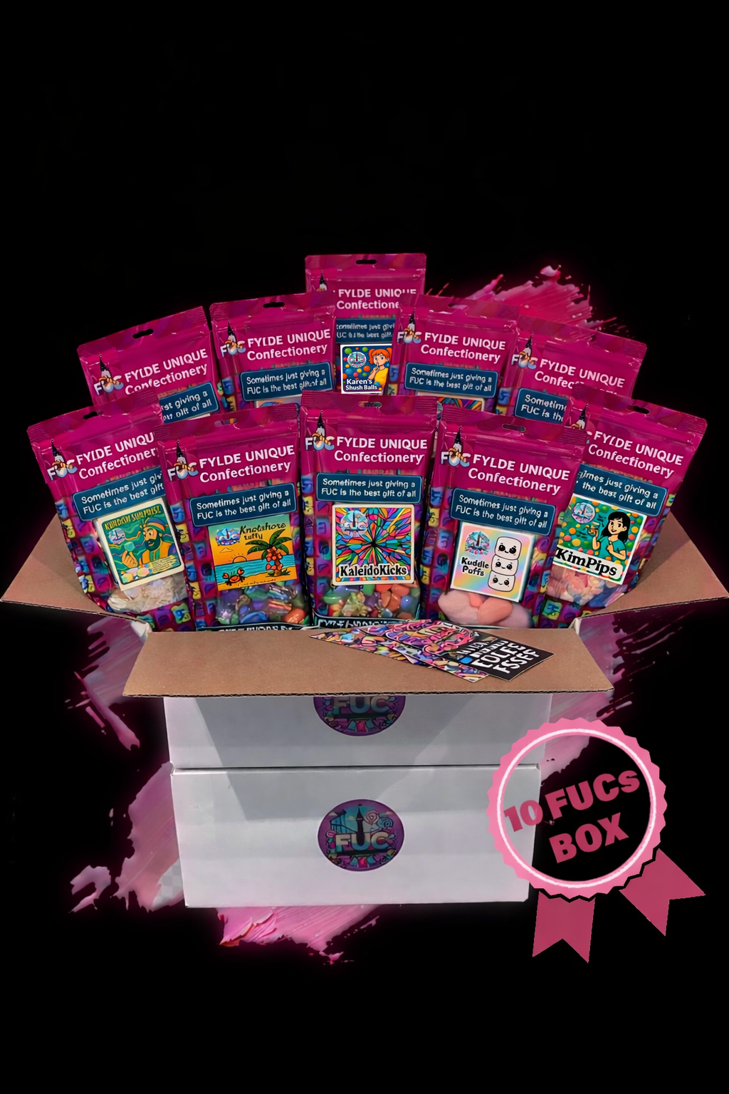 10 full-throttle bags of flavour mischief with 10 “Fucs to give” and 1 “sorry I’m out of Fucs to give” stickers.