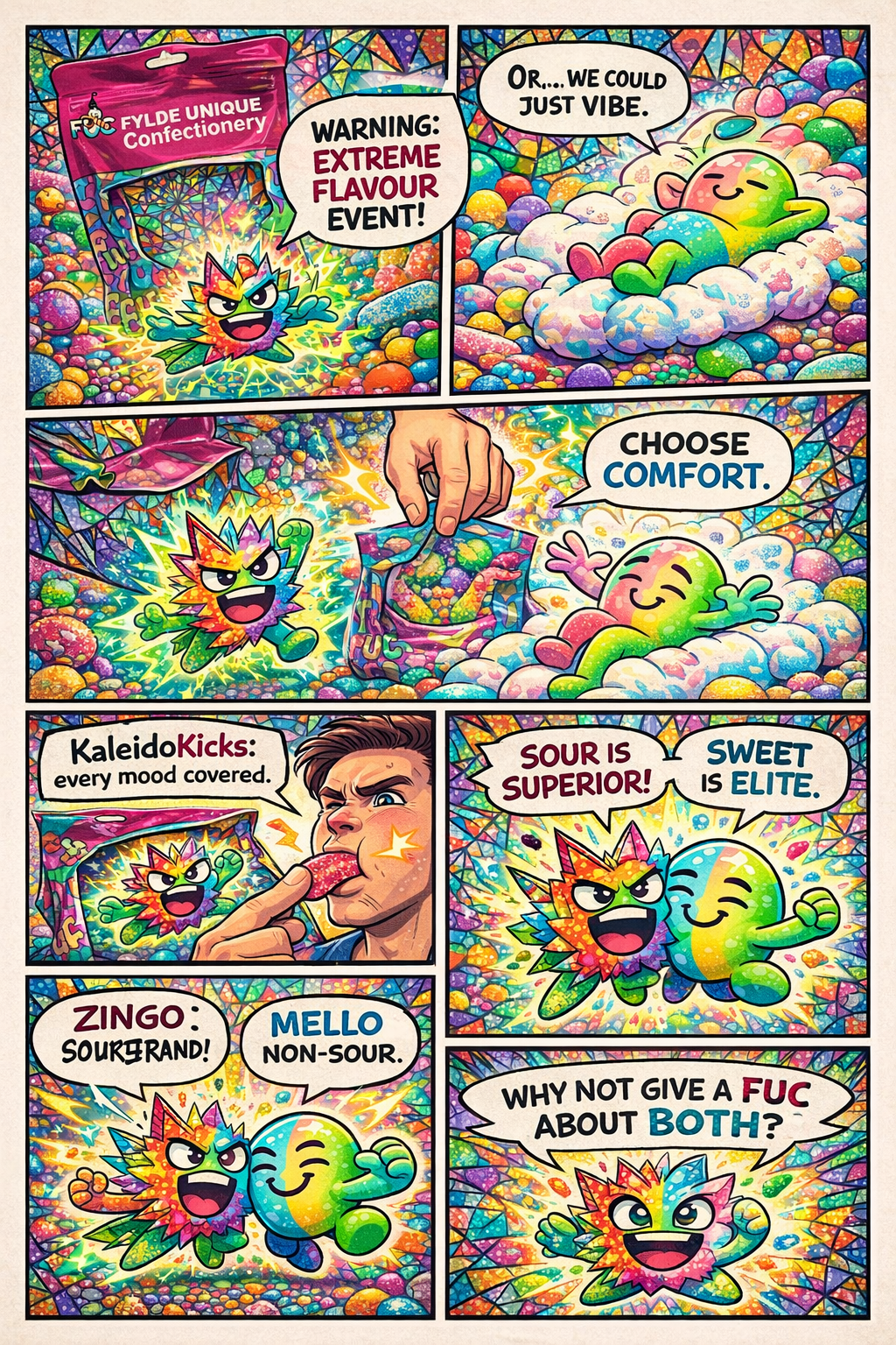 These aren’t your basic sweeties — Kaleidokicks are a neon riot of mouth-puckering mayhem. A wild mix of sour flavors that don’t wait for permission and never say sorry. Each bite slaps harder than your ex’s excuses.